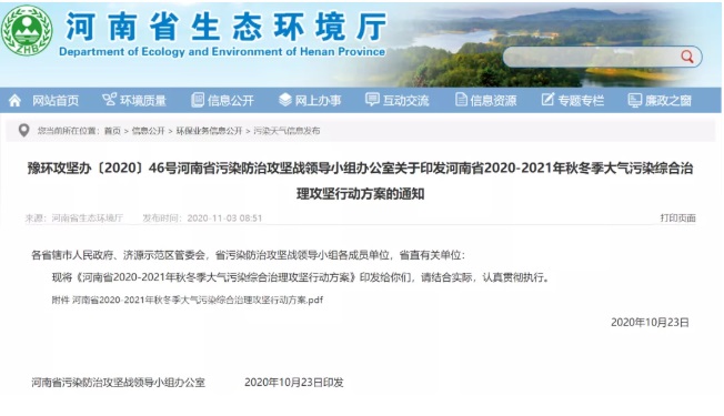 10月23日,河南省污染防治攻堅戰領導小組辦公室發布關于印發《河南省2020-2021年秋冬季大氣污染綜合治理攻堅行動方案》的通知。